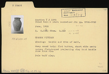 | Description: | Handle and bits of wall missing. Flat bottom; deep round body; short wide neck; narrow flat-topped projecting rim; band handle rose from rim. Pale buff clay. | |
