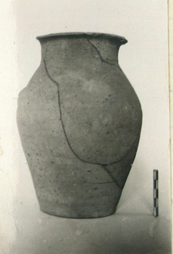| Description: | Handle and bits of wall missing. Flat bottom; deep round body; short wide neck; narrow flat-topped projecting rim; band handle rose from rim. Pale buff clay. | |