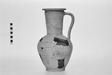 | Description: | Bits of body and part of lip missing. Disk foot, slightly concave beneath; ovoid body; tall neck spreading slightly to out-turned lip; handle ridge below lip; band handle from ridge to near edge of shoulder. Buff clay, fabric coarse but thin; remains of resin on bottom and lower walls inside. | |