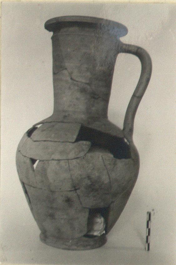 | Description: | Bits of body and part of lip missing. Disk foot, slightly concave beneath; ovoid body; tall neck spreading slightly to out-turned lip; handle ridge below lip; band handle from ridge to near edge of shoulder. Buff clay, fabric coarse but thin; remains of resin on bottom and lower walls inside. | |