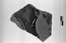 Description:   Wall fragment from bell krater, handle attachment at left. Torso and lower part of head of bearded satyr, to right, carrying lyre. Egg pattern around handle. Good glaze inside; partial relief contour.