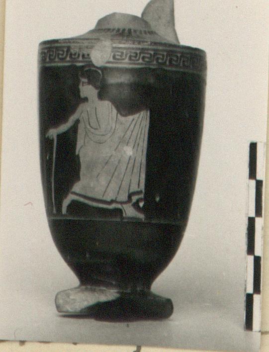 | Description: | Neck, mouth and most of handle missing; foot chipped. Boy in himation running right, looking back left. Above scene, single maeander; below, reserved line. On reserved shoulder, four linked palmettes and short tongues. Large red splotch on one side - kiln accident. | |