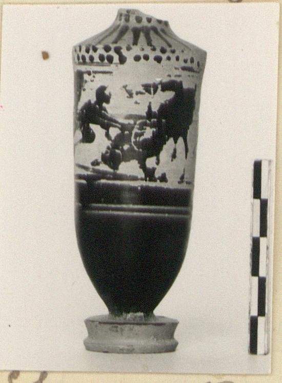 | Description: | White Ground. Neck and handle missing. Shape and ornament similar to P 25511 (ΠΘ 3575). Herakles and the bull. Red details. ADDENDA P 25511: Small chimney lekythos with double rays on shoulder; dots above scene; pair of reserved lines below. High foot with concave profile, outer face reserved. | |