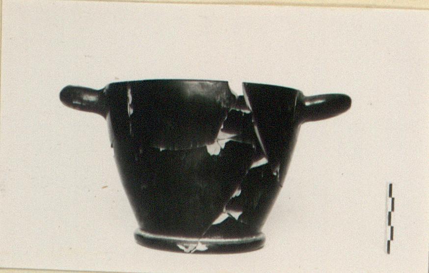 | Description: | Fragments of wall and rim missing. Reserved and incised line at base of wall, otherwise as P 25528 (ΠΘ 3592), except circles on underside in dilute. | |