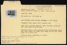 | Description: | Fragment from upper wall towards rim. Part of cloaked figure, very coarsely rendered, and some lines behind him. Probably from a pot spoiled before finishing, since the boy's head is drawn very high up and the lower edge is in part cut. Lifting hole, unglazed, at left. | |