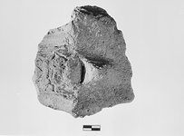 Description:   Part of lug handle with start of wall. Inside, elaborately wreathed satyr head, with projecting beard. Surface gone below the eyebrows. Outside, above, a recessed panel with a rosette at the center. Below, a row of dentils crowning three ribbed verticals.