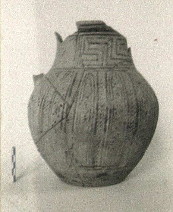 | Description: | Mended from many fragments, preserving most of wall, neck, and part of rim of godrooned jug. Beginning of one handle preserved. Zigzags in the flutes, connected circles on ribs. Maeander and panel ornaments on neck. Round mouth, band handle. Glaze much worn. Clay pinkish-buff. | |