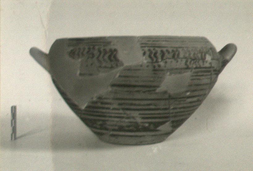 | Description: | Parts of wall and rim, with one handle, restored. Body banded, birds in shoulder zone. Base flat. Inside glazed. Peeled red glaze. | |