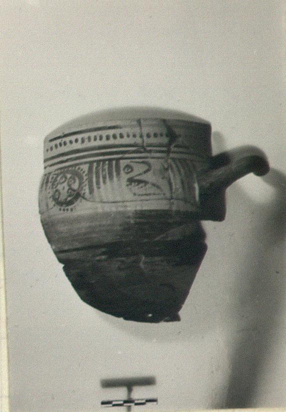 | Description: | Preserved about half of wall, one handle, and a non-joining fragment with base and part of wall. Vertical rim, banded. Between handles, birds and "triglyphs". Solid glaze beneath. Glaze streaky inside and out. Clay pinkish-buff. | |