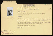 Description:   About one-quarter of wall and rim, and part of one handle preserved. Mended from many fragments and restored in plaster. Vertical rim, banded, with zone of dots. Plain base. In shoulder zone, birds and squiggles.