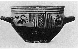 | Description: | About one-quarter of wall and rim, and part of one handle preserved. Mended from many fragments and restored in plaster. Vertical rim, banded, with zone of dots. Plain base. In shoulder zone, birds and squiggles. Glaze badly worn, fired red. Clay pinkish-buff. | |