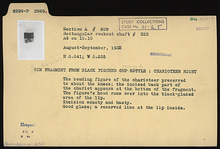 Description:   Rim fragment depicting the bending figure of a charioteer preserved to about the knees; the incised back part of the chariot appears at the bottom of the fragment. The figure's head runs over into the black-glazed area of the lip. Incision scanty and hasty.