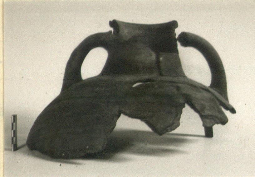 | Description: | Many fragments make up to much of rim, neck and shoulder, with both handles; lower wall fragments and toe do not join. Restored in plaster. Round-bodied amphora; thickened rim; handles from well below rim. Heavy solid toe; resting surface slightly raised. Handle decorated with elaborate pattern of stamped lozenges, zigzags and circles. Heavy cooking ware fabric, considerably blackened. | |