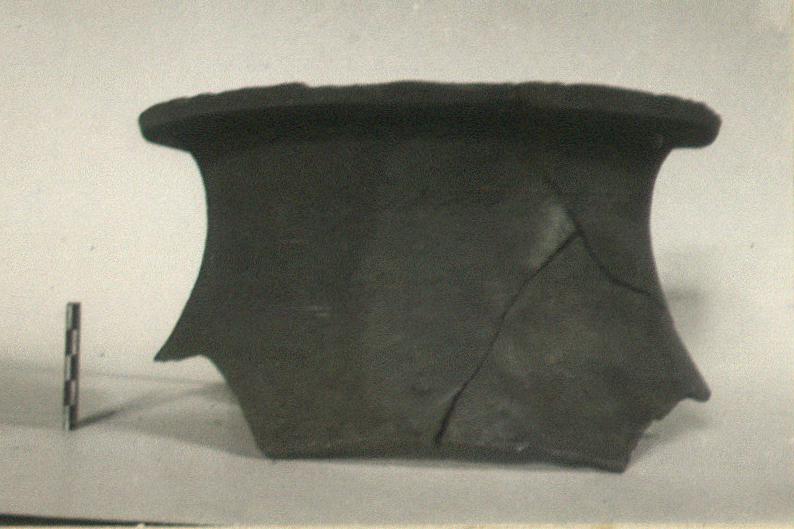 | Description: | Preserved to shoulder, with about two-thirds of the circumference of the rim. Flaring rim, flat on top. On shoulder incised ornament of line and oblique dashes. Micaceous ware. | |