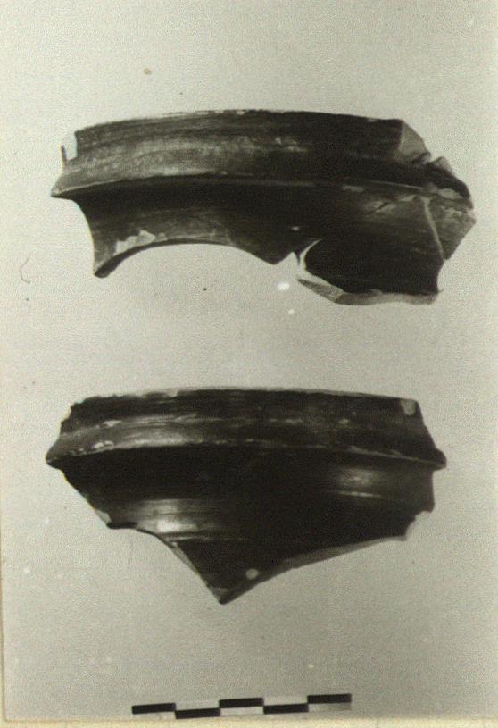 | Description: | Three fragments of which two join, giving neck and beginning of shoulder. Straight rim with ridge below on exterior. Two lightly incised lines beneath the glaze at juncture of neck and shoulder. Black glaze with chocolate cast. Clay pinkish-buff. | |