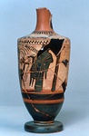 | Description: | Mended from many pieces; the lip entirely missing and the handle save for its upper attachment. Strengthened with plaster at the back and on the shoulder; pieces missing throughout the body. Palmettes and a row of short strokes on the shoulder; at the top of the figured panel a zigzag band; below it a black band with red line and a reserved band. A moulded ring at the top of the foot, which is unglazed beneath. In the center of the figured panel, a fawn, right, standing in front of a palm tree. To the left, a bearded figure, wreathed and cloaked, faces the fawn. In his left hand he holds a lyre; with his right he grasps the end of the animal's tail. A similar figure (head missing but from the drapery possibly female) faces the fawn at the right of the picture and holds out her right hand toward his head. Behind her, a Doric column. Vine filling ornament. Careless incision. The glaze somewhat grayed. White slip covers both the shoulder and the figured panel, irregularly applied at the bottom. | |