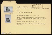 | Description: | Mended from many fragments. Front part of rim and neck, with much of wall and part of bottom missing; restored in plaster. Rounded body; double rolled handles. Pinkish-buff clay with lighter buff surfacing. No glaze. | |