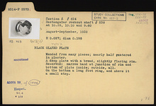 | Description: | Mended from many piecees; nearly half restored in plaster. A deep plate with a broad, slightly flaring rim. Reserved: a narrow band at junction of rim and bottom of plate inside; outside, all. On the bottom a long foot ring, and above it a small step. Cf. Agora XII, no. 1006. | |