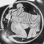 | Description: | Mended from several pieces; nearly half the rim preserved and the start of both handles. The stem entirely missing. Irregular reserved circle framing the medallion which depicts a crouching warrior, right. The medallion complete save for a small piece through the warrior's right arm and the border. The warrior, nude save for his cap and a cloak over his outstretched left arm, faces right in a crouching, or knee-running position, a spear in his right hand. At the forehead the cap has a sort of beak, or perhaps his hair is showing. Narrow eye, full face; the glaze has peeled off from the lines at the inner corner. Handle spaces not reserved. Traces of red wash. Relief contours; the inner drawing in heavy relief lines. | |