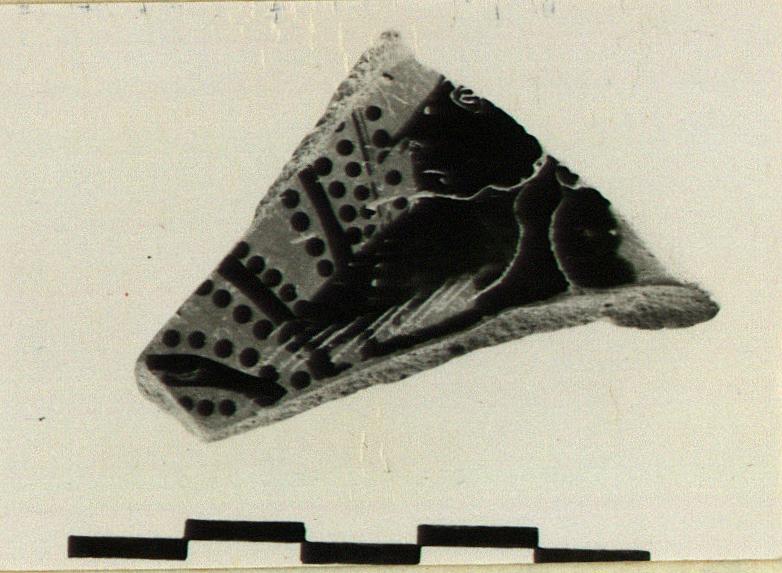 | Description: | From the wall of a closed vase. Head of bearded man, left. Broken in field. Faded red for beard. | |