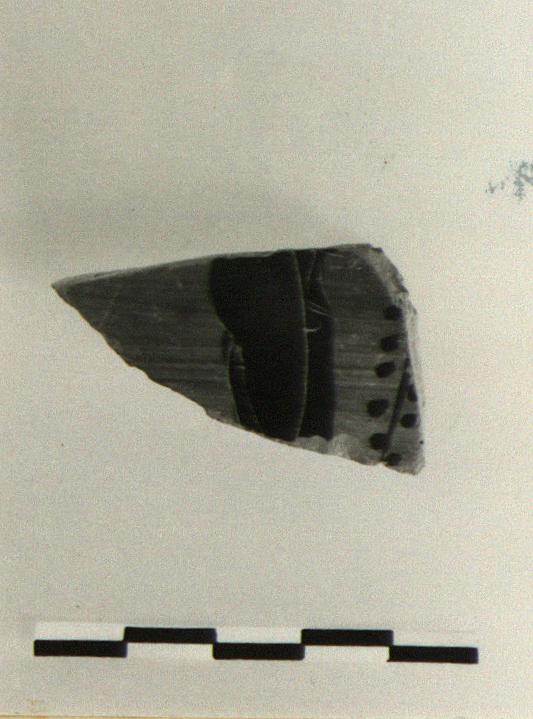 | Description: | Small wall fragment from large closed pot. Mid-part of standing nude youth right. Branch in field at right. | |