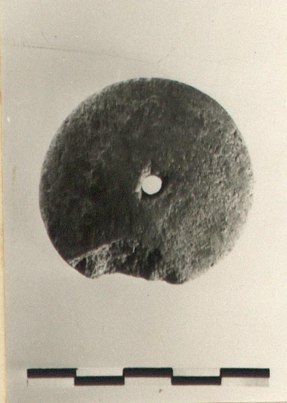 | Description: | Chips missing from one side. Flat bottom; shallow convex top. Clay gray at core, light brown at surface. | |