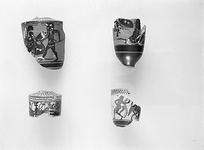 | Description: | Fragment of wall with start of shoulder. On the shoulder, tips of debased lotus pattern. Top of wall decorated by double row of dots within two pairs of narrow bands. Decorative panel depicts forepart of three horses right, the legs missing. Bent arm and part of right side of male figure in front of horses. Behind the horses, a standing figure(?). Red for horses' manes, part of harness and part of the man's garment. Joins P 2767. | |