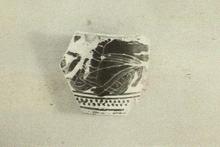 | Description: | Fragment of wall with start of shoulder. On the shoulder, tips of debased lotus pattern. Top of wall decorated by double row of dots within two pairs of narrow bands. Decorative panel depicts forepart of three horses right, the legs missing. Bent arm and part of right side of male figure in front of horses. Behind the horses, a standing figure(?). Red for horses' manes, part of harness and part of the man's garment. Joins P 2767. | |