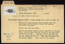 | Description: | Mended from many pieces; much missing from rim and sides and the handle except the spring. Restored in plaster. Offset rim, low flat base. Narrow red lines inside at junction of lip and body, two more part way down the interior and one wider around the center. Outside: one line at junction of lip and body, two part way down, two near the base and one contiguous to it. The base and handle zone reserved. Fine fabric; best glaze. | |