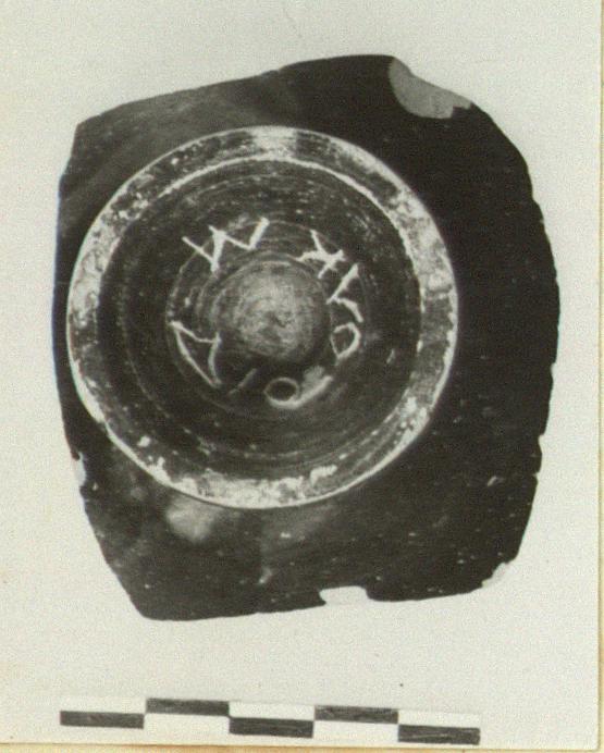 | Description: | Base and lower part of walls preserved. Moulded base, conical inside. Stamped rouletting on floor. Graffito inside base: <graphic> Buff clay. Black glaze. | |