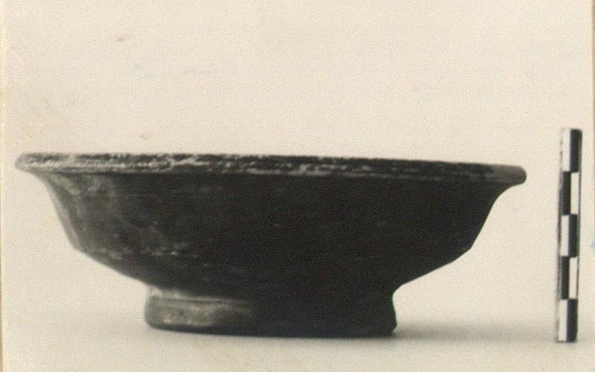 | Description: | Intact except for chips. Out-turned rim; high ring base. Much worn black glaze, misfired red on one side and base. | |
