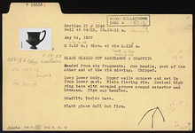 Description:   Mended from six fragments. One handle, part of the other and part of the rim missing. Chipped. Deep lower body. Upper walls concave and set in from lower part. Plain flaring rim. Conical high ring base with scraped groove around exterior and beneath. High cup handles.