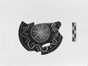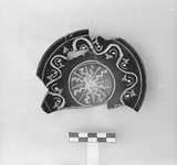 | Description: | Small deep bowl with plain rim. Much of wall and rim missing; mended from many fragments. Painted inside; center: a star of alternate buff rays and white wavy lines within scraped groove. Above, buff ivy leaves alternated with single white wavy line. Scraped groove below rim. Five grooves on lower wall outside. Small flat base. Glaze black to red. | |