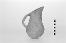 | Description: | Cracked but complete. Round bottom; narrow body; uptilted trefoil mouth; rolled handle. Coarse buff clay; pale buff surfacing. Fragments of another in container 3. | |