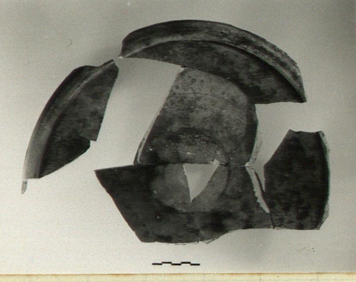 | Description: | Mended from many fragments; base and about one-third of wall and rim preserved; restored in plaster. Ring foot; flaring walls; wide overhanging rim. Light yellow-buff clay. Mottled black glaze on top only. | |