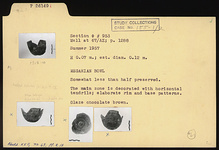 | Description: | Somewhat less than half preserved. The main zone is decorated with horizontal tendrils; elaborate rim and base patterns. Glaze chocolate brown. | |