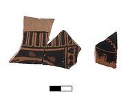 | Description: | a) From top of shoulder. The panel decoration depicts a reserved vine-stem(?) with leaves in added red. Reserved band inside, just below start of neck. b) From near top of wall; preserves part of boy's head, left. Reserved scalloped hairline. Red for fillet. Relief lines. Brownish glaze inside. | |