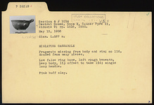 | Description: | Fragments missing from body and rim; no lid. Mended from many pieces. Low false ring base, left rough beneath; deep body; lip offset to take lid; single loop handle. Pink-buff clay. | |