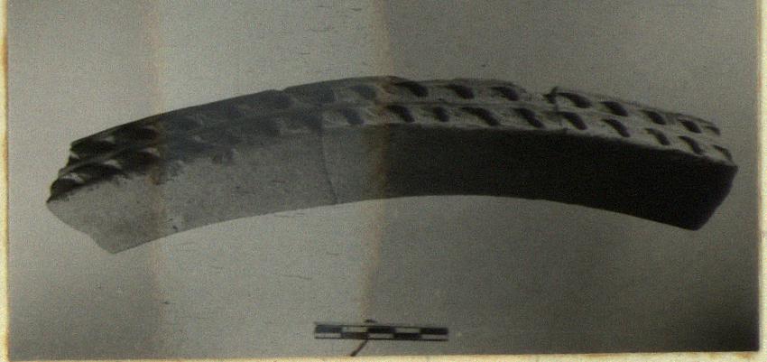 Description:   Three joining fragments preserve part of the rim and floor of a large shallow basin; the rim flat on top and with a deep overhang. On its vertical face, a rough leaf pattern made by oval gouges to either side of a central stem.