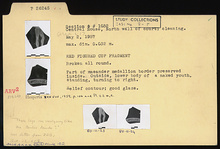 | Description: | Broken all around. Part of maeander medallion border preserved inside. Outside, lower body of a naked youth, standing, turning to right. Relief contour. Good glaze. ADDENDA Cf. Letter from JDB, 13 Oct. 1958. | |