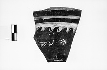 | Description: | Fragment from rim and upper wall. Incised pattern: dolphin above waves. The waves filled in with white; dot rosette in white beside dolphin. | |