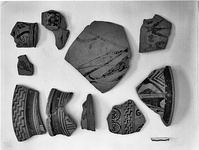 | Description: | Two non-joining rim and neck fragments. Rim rounded outside with step maeander. Below part of a panel with hanging spiral. Red glaze. | |