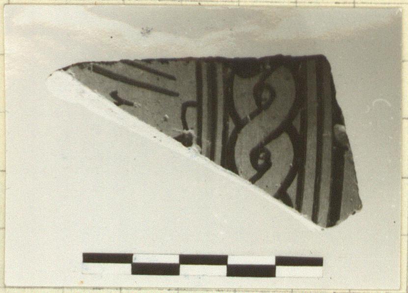 | Description: | Fragment broken all around. Guilloche. At bottom, clay to right; strands of a mane. Glaze brown to black. Cf. Munich 6077; London 1865.7-20.1(A 471). | |