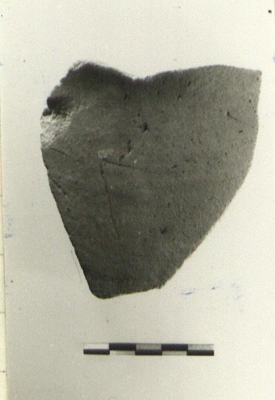 | Description: | One edge of fragment curves up toward neck. Graffito(?): <graphic> Micaceous light brown clay. Mendean? | |