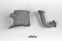 | Description: | a) Upper part of jar mended from many fragments. Some restoration. b) Toe, with two joining fragments. Clay light reddish buff. No smear inside. Note marks of anti-sag binder on lower body. Series of P 21990 (Boulter Well, frag.). | |