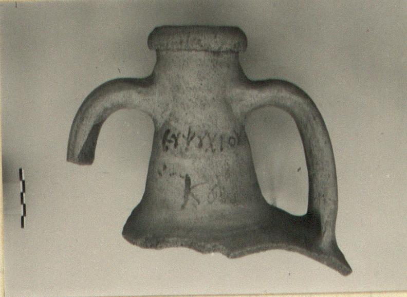 | Description: | Rim, neck, part of shoulder, one handle and part of another preserved. On neck, dipinto in red. Pale clay. | |