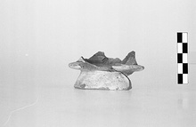 | Description: | Two joining fragments preserve floor and part of foot. Flange around base. Wide ring foot. Painted white outside except for red band above flange. Red paint underneath. | |