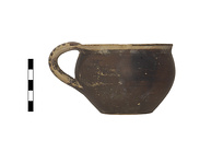 | Description: | Complete but chipped. Mended from three fragments. Flat base, walls bulging in middle, slightly flaring lip and ribbon handle. "Coon's tail" handle. Brownish-black glaze inside and out except for base and two reserved bands inside and outside lip. | |