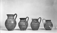 Description:   Mended from many fragments. Restored in plaster. Wide, round mouth, full body, broad ribbon handle; slight indication of disk foot. Band of broad line around neck. Broad wavy line on shoulder and handle. Three sets of fine dark lines on body.