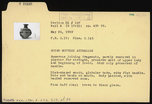 Description:   Numerous joining fragments, partly restored in plaster for strength, preserve most of upper body and beginning of lower. Stub only preserved of handle. Disc-shaped mouth, globular body, wide flat handle. Dots and bands on mouth. Body painted, with banded reserved zone.